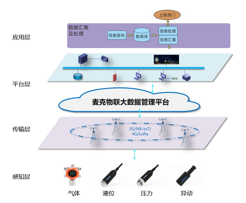 管廊監測系統的感知層一般需測量有毒氣體濃度、供水管道壓力、井下水位、井下圖像以及井蓋異動狀態,常用的有氣體傳感器、壓力傳感器、液位傳感器以及異動傳感器。