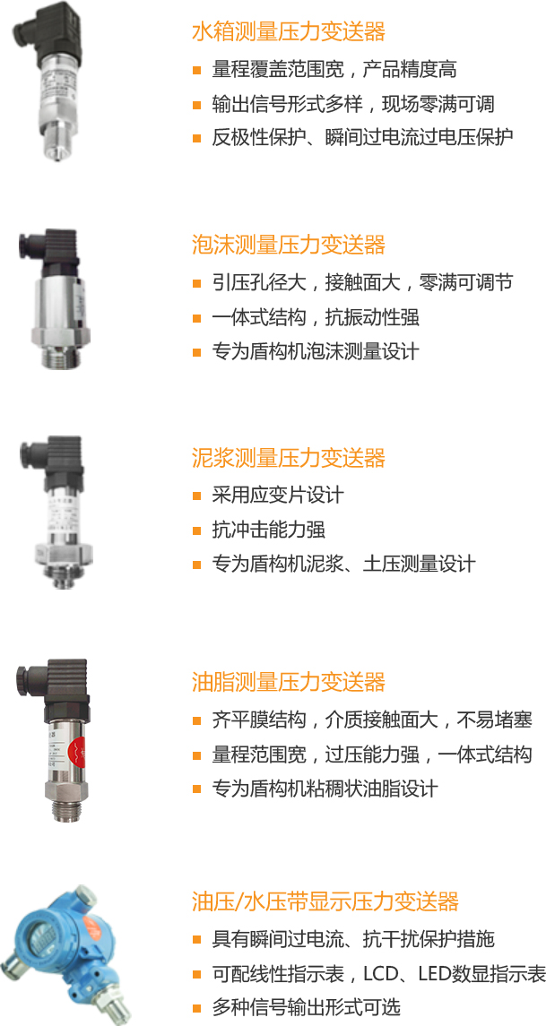 麥克傳感作為國內傳感器行業的先行軍,利用已掌握的核心技術,為盾構機應用量身定制一系列專用傳感元件,對整個設備的水箱、液壓油、土渣、泥漿、泡沫等介質的壓力測量提供可靠穩定的監測。