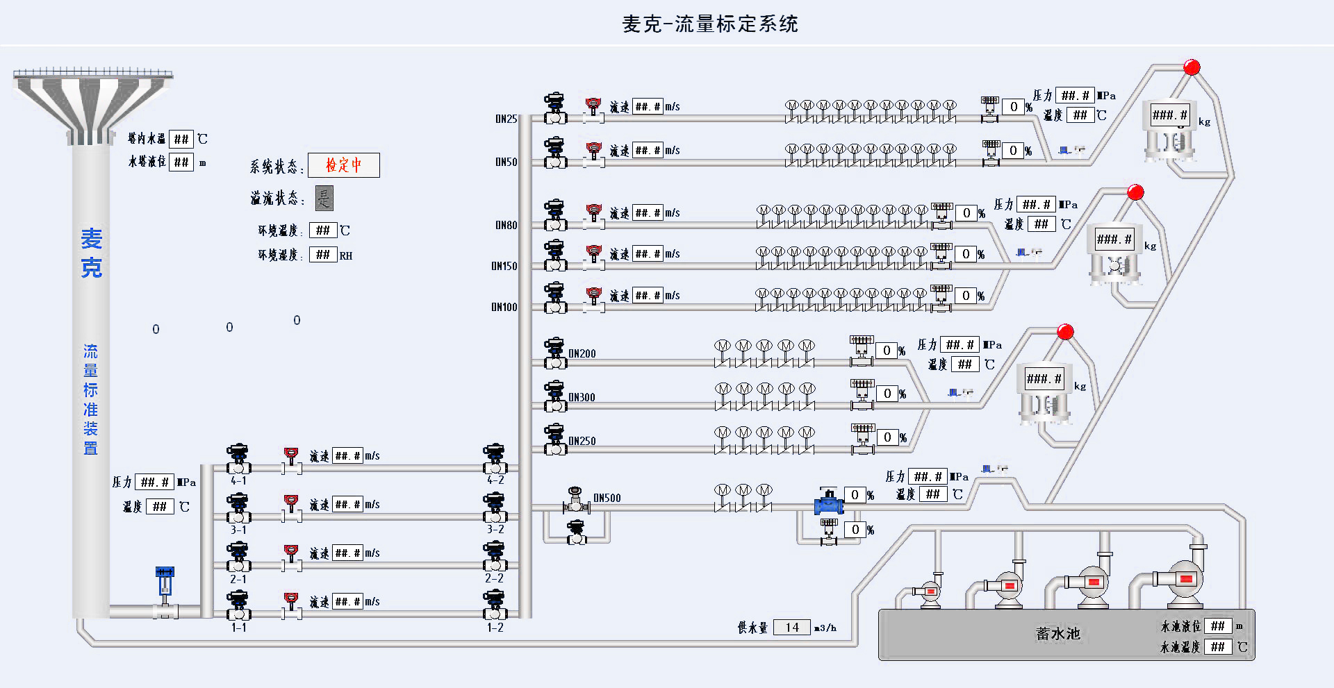 麥克團隊研發建造了一套以高位水塔為穩壓源,采用靜態質量法與標準表法結合,專用于電磁流量計的標定裝置裝置不確定度優于0.05%的一等流體流量裝置級別,通過了陜西省計量院鑒定審核