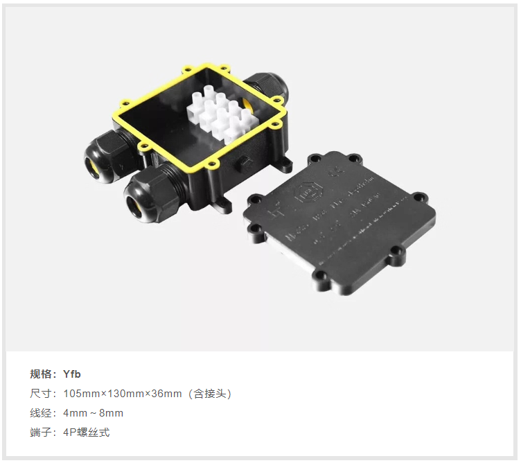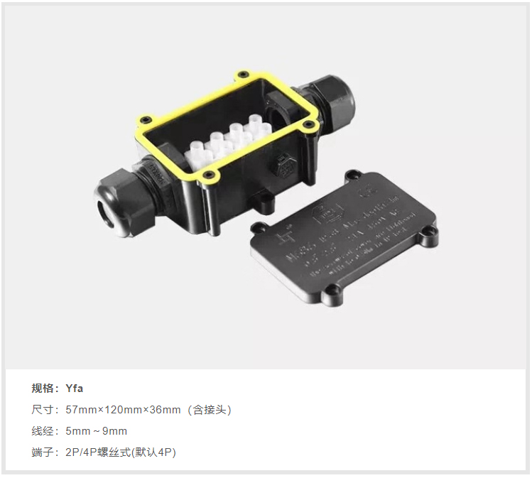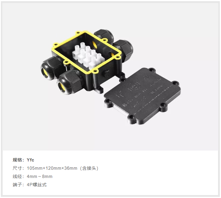 防水接頭與防水接線盒配套使用,實現線纜接頭防水需求。根據開孔數量,可分為一進一出,一進二出,二進二出。